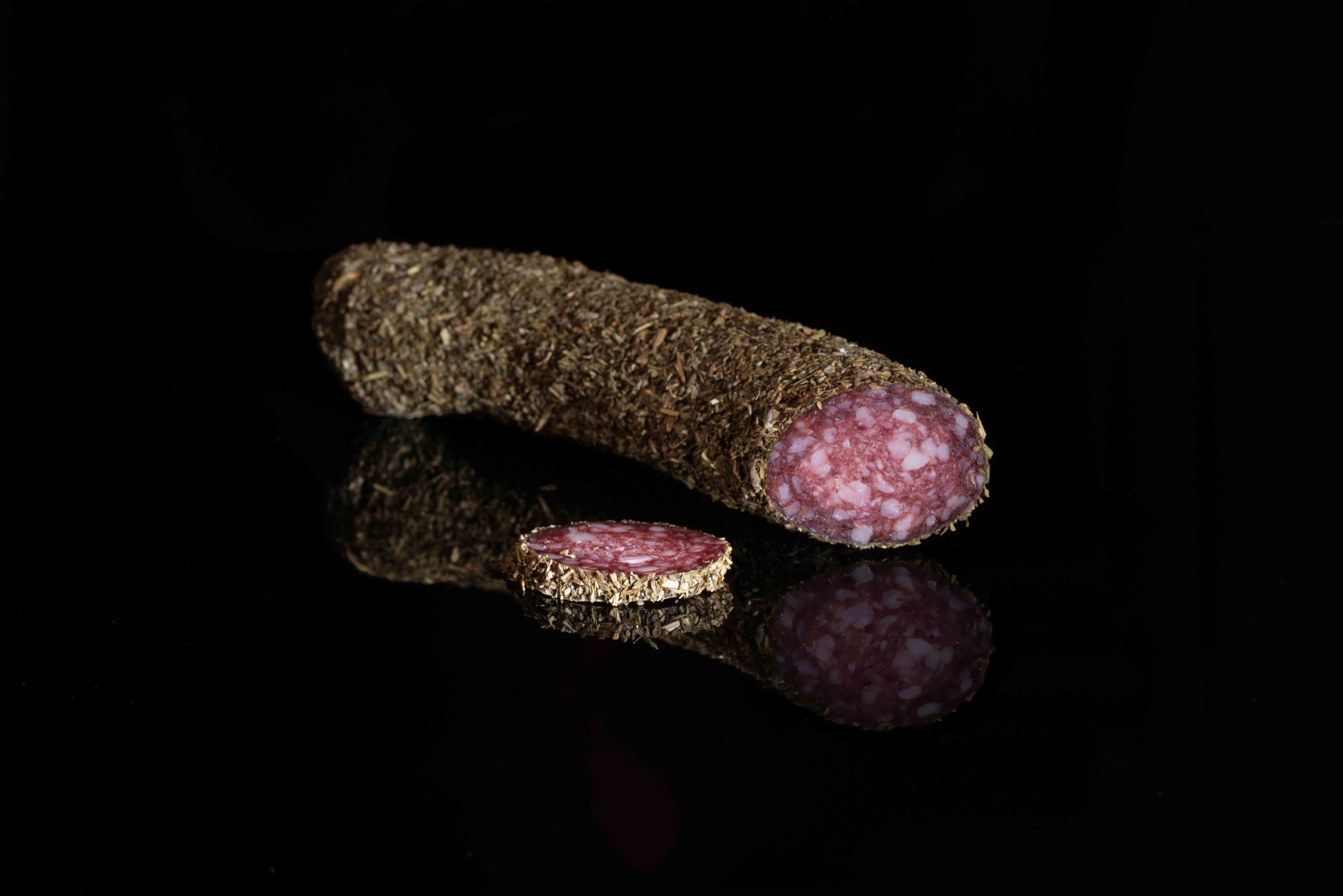Viande de porc, de boeuf, sel, épices, vin rouge, fibre végétale, enveloppe comestible de boeuf, viande Suisse, produit à base de viande à consommer cru, se conserve sans réfrigération, peut subir une perte de poids