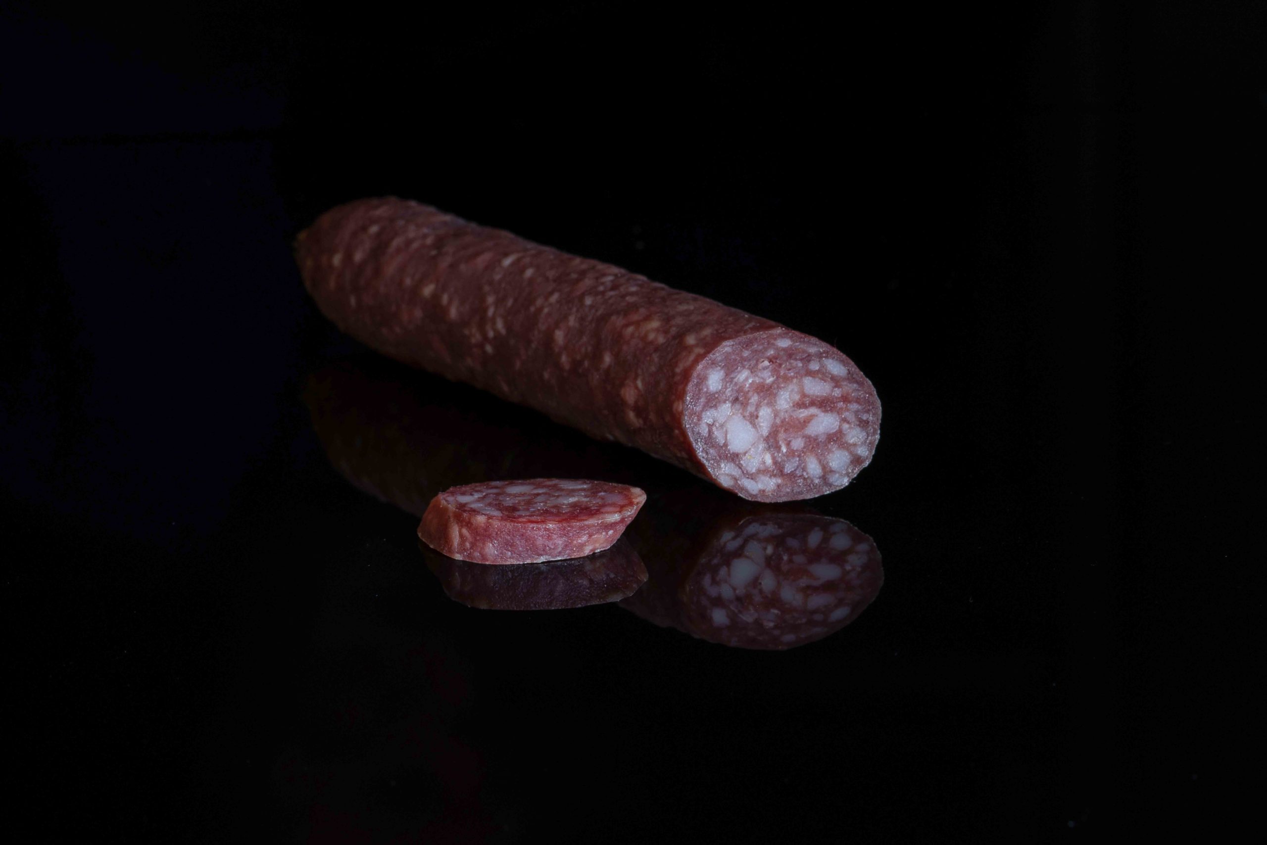 Viande de bœuf, de porc, sel, épices, ail 0.4%, Conservateur : E215, E250, Acidifiants : E330, E331, Antioxydants : E304, Epaississant E415, Exhausteur de goût : E621, fibre végétale, enveloppe comestible, viande Suisse, produit à base de viande à consommer cru, se conserve sans réfrigération, peut subir une perte de poids